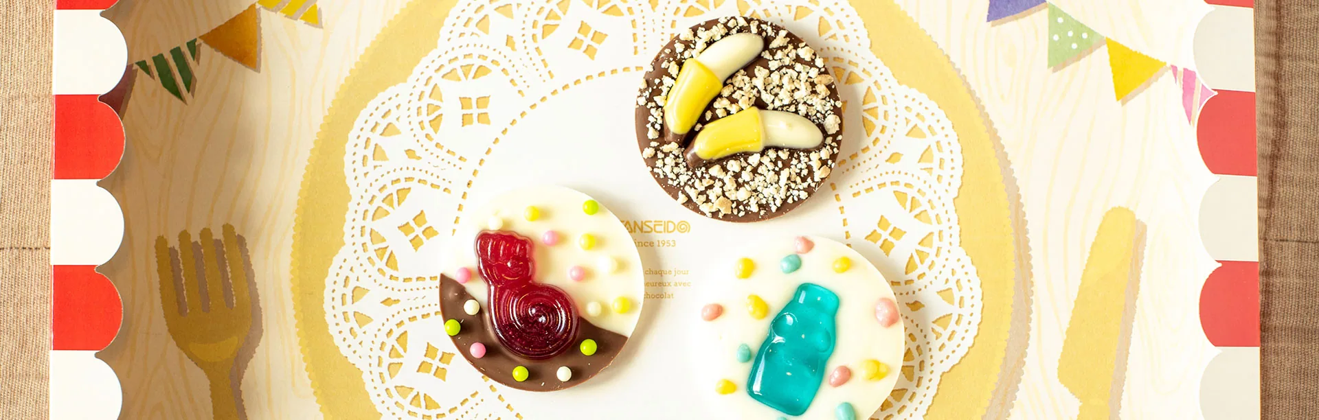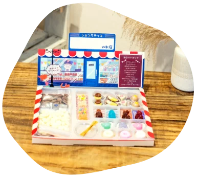 「もし、パリに駄菓子のショコラティエがあったら」をテーマにデザインしたキュートなBOXに色とりどりの駄菓子たちが整列しています。